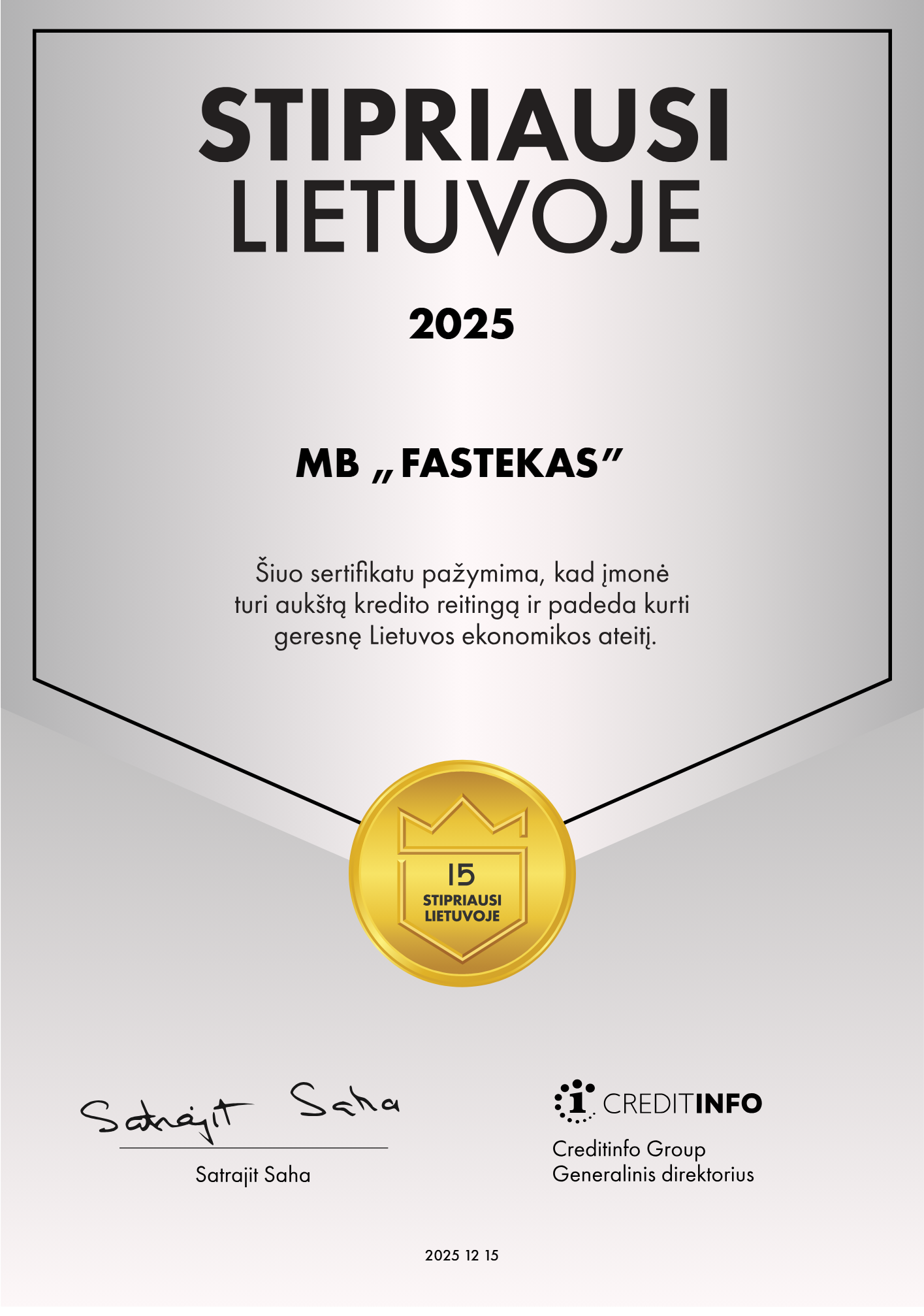 Įmonė sertifikuota kaip A++ klasės lyderė savo dydžio kategorijoje ir veiklos sektoriuje, atitinkanti aukščiausius verslo stabilumo, patikimumo ir veiklos skaidrumo standartus.
